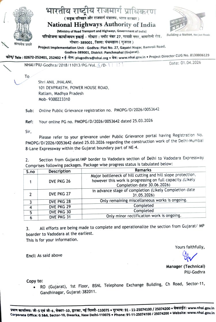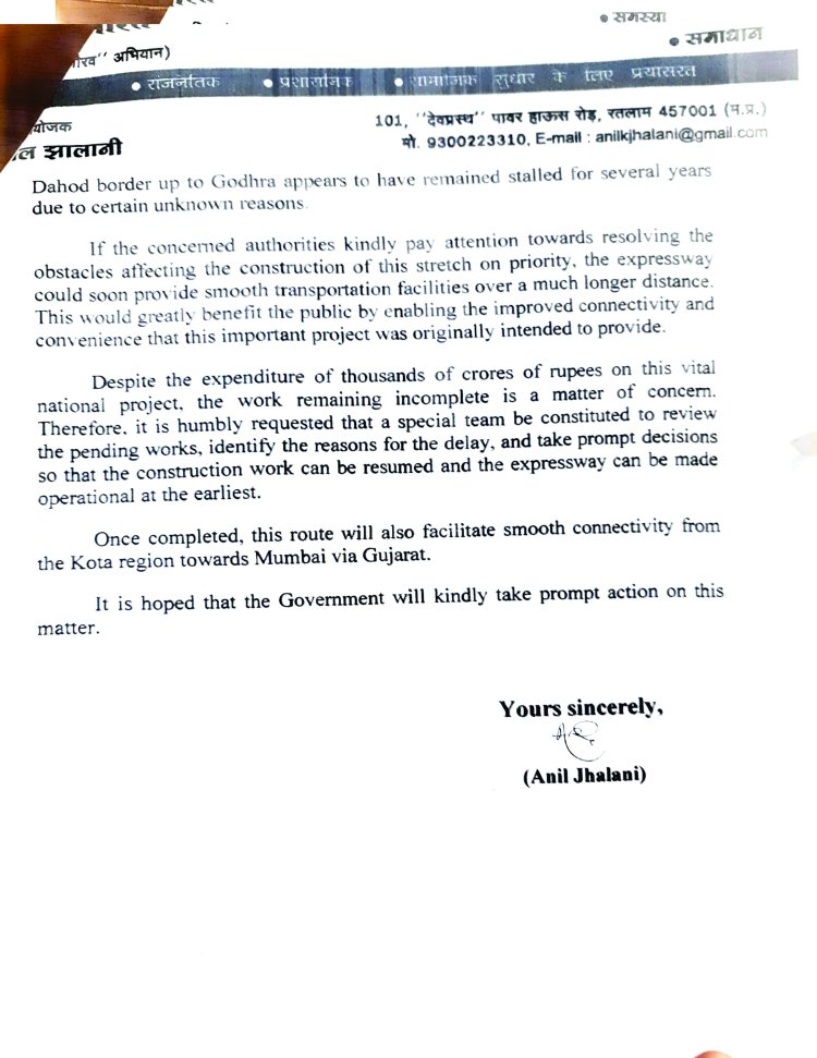 दो माह बाद एटलेन एक्सप्रेस वे से मुंबई जा सकेंगे रतलामवासी.....समाजसेवी अनिल झालानी के पत्र पर राष्ट्रीय राजमार्ग प्राधिकरण की प्रोजेक्ट इंप्लीमेंटेशन यूनिट ने दिया जवब